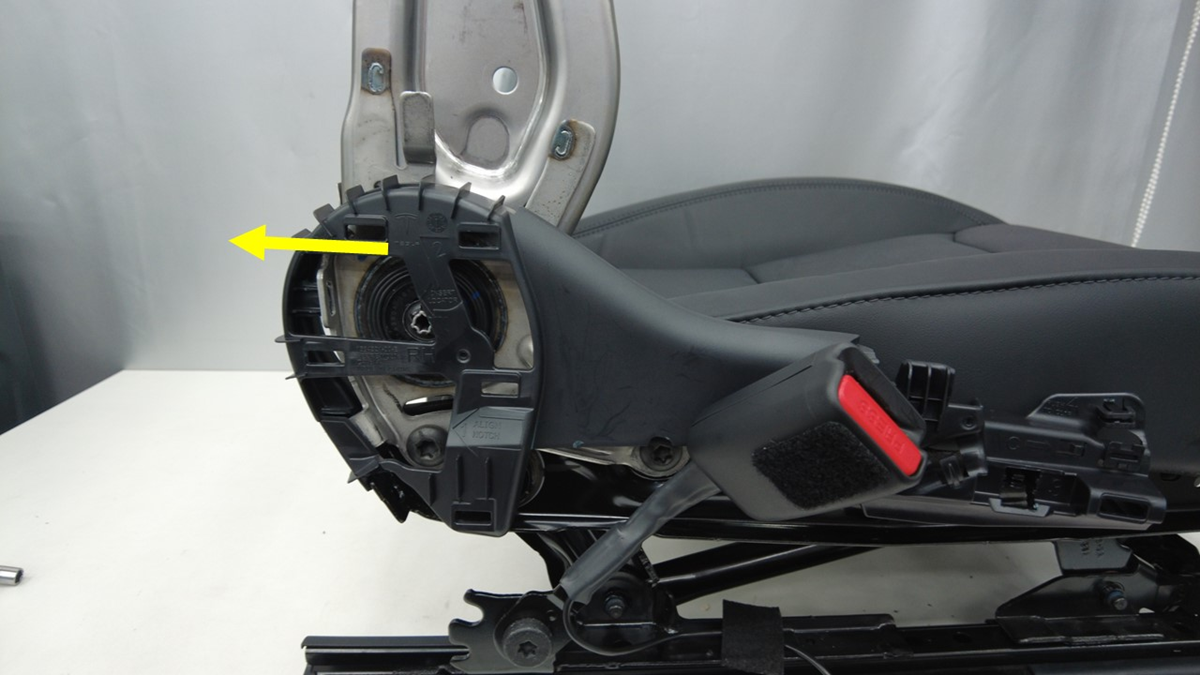 Retirez le support du couvercle latéral intérieur du siège avant gauche en le faisant glisser vers l'arrière.