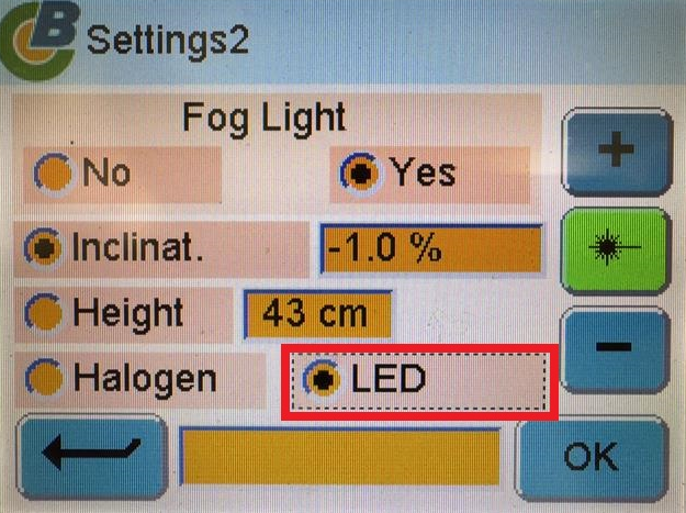 RemarqueTurn on laser aimer to adjust the tester horizontal and vertical position to the center of LH fog light. Turn off the laser aimer before proceeding to the next step.