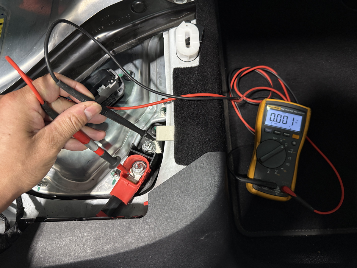 RemarqueSi la tension aux bornes de la batterie est de 0, il se peut que la batterie soit éteinte en interne. Utilisez une batterie plomb-acide de 12 V pour effectuer un test. Pour les techniciens sur la route : utilisez la batterie plomb-acide de 12 V qui se trouve dans le véhicule de service mobile.ATTENTIONSi la tension aux bornes de la batterie auxiliaire basse tension est inférieure à 13 V ou supérieure à 16 V, le multimètre ne mesure pas de manière fiable et ne doit pas être utilisé.