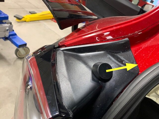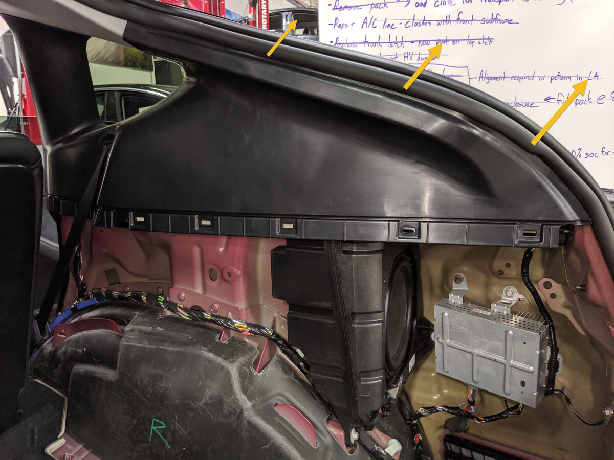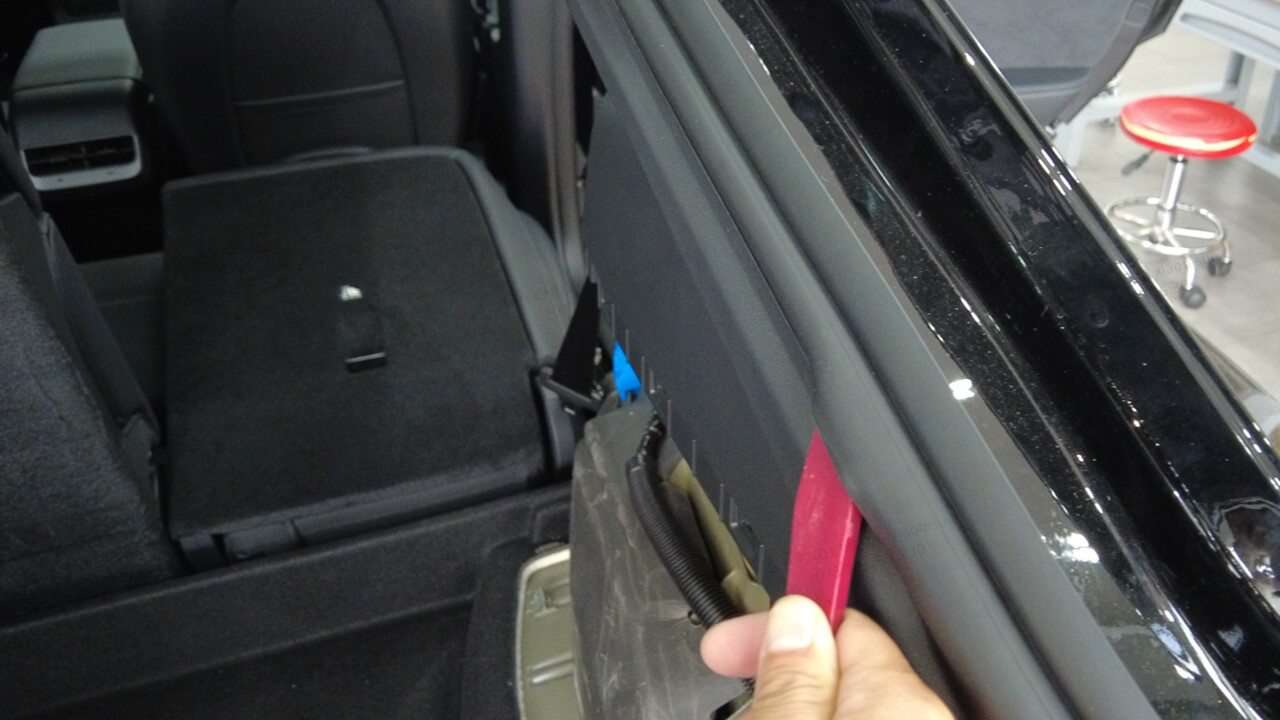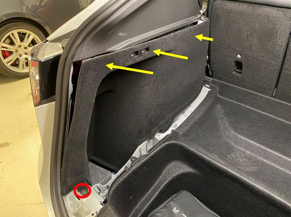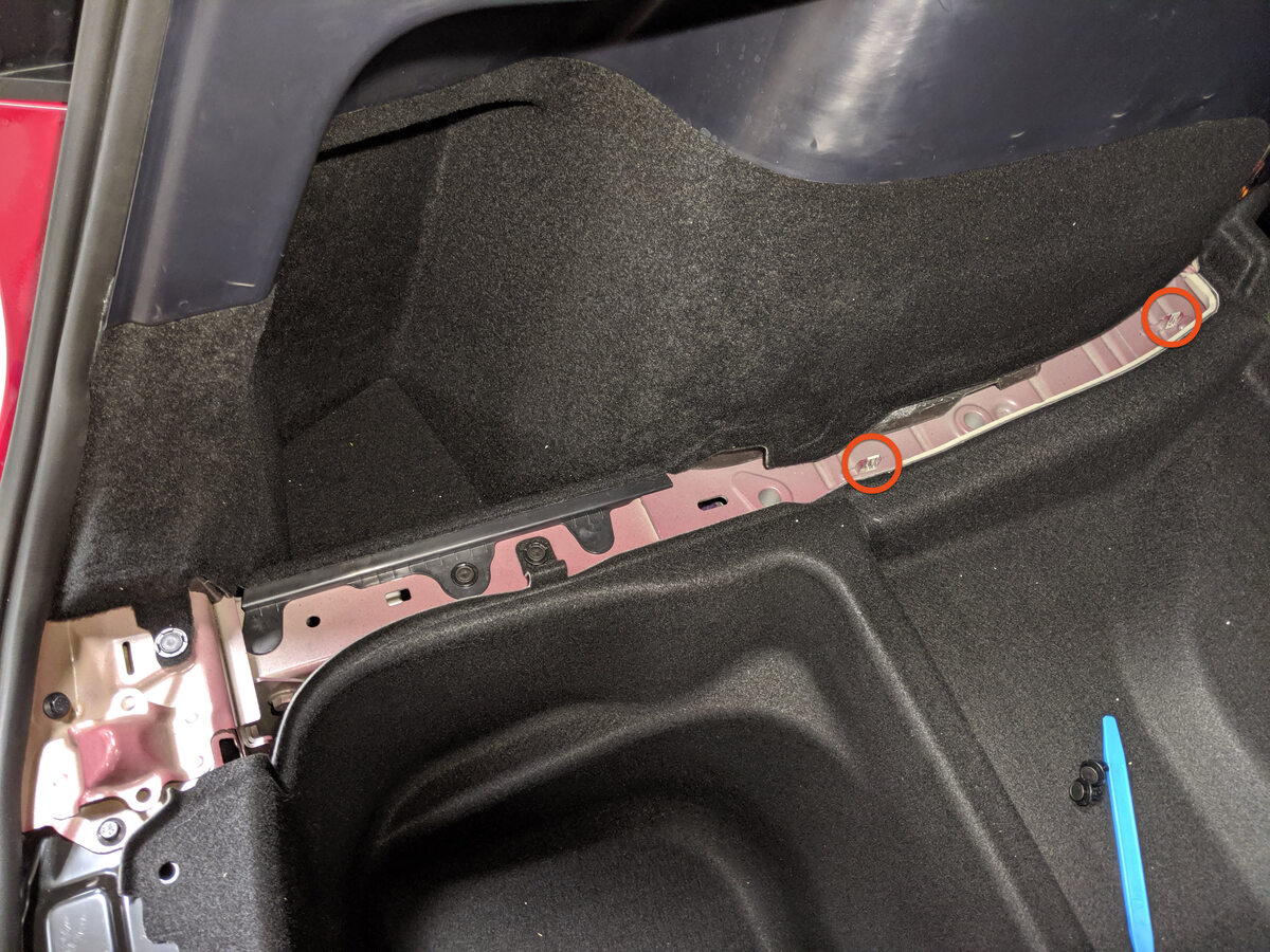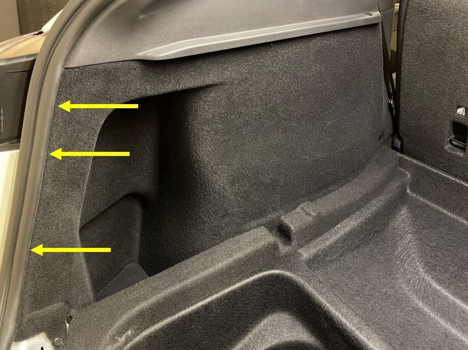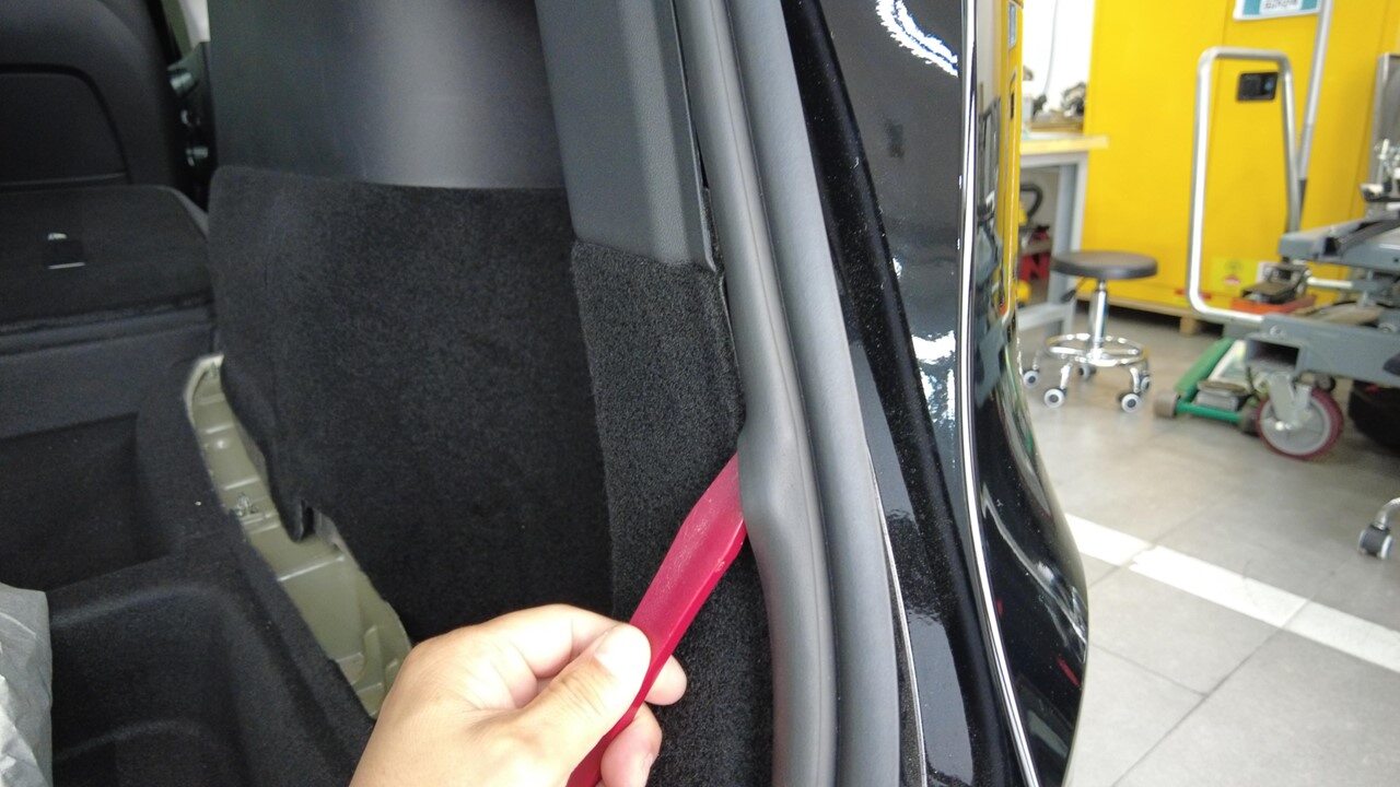 참고1x push clip, 13x clips, Guide front clip stanchions around RH C-pillar, trunk seal to edge of trim, trim part may slightly differ by vehicle build location, and the number of clips may also vary