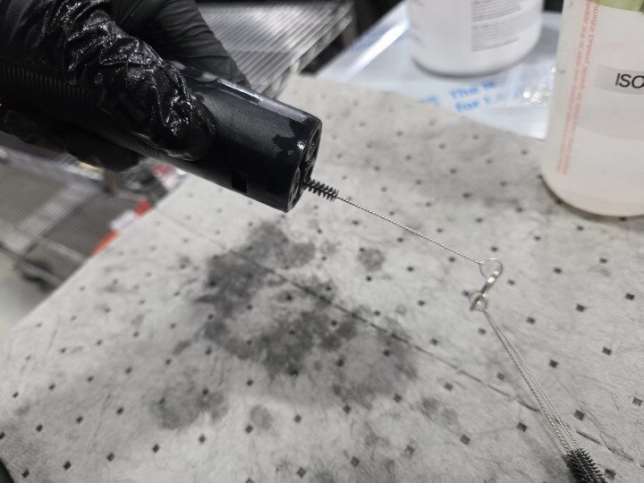 커넥터가 아래를 향하게 한 상태에서 커넥터 구멍에 이소프로필 알코올을 분사합니다.