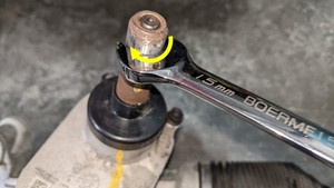 참고타이로드 엔드를 반시계 방향으로 회전합니다. 샤프트에 렌치를 사용하여 압력을 분산하는 데 도움이 되도록 합니다.