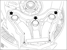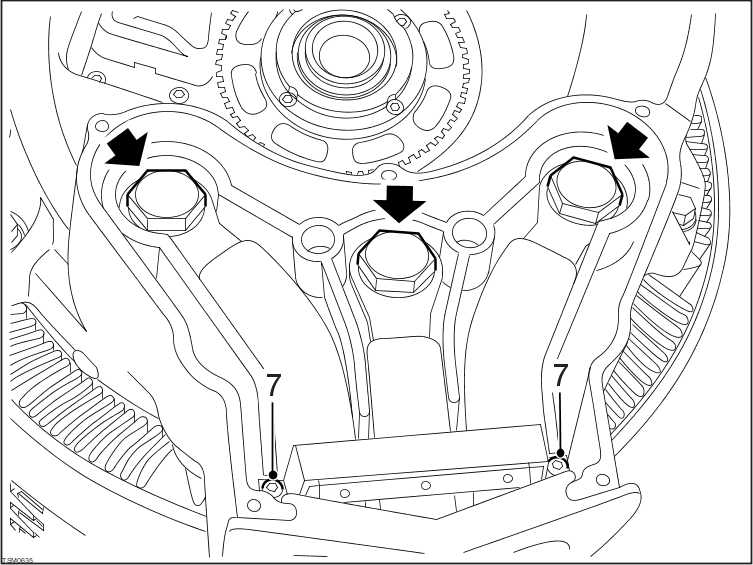 - Remove brass bolts (x3), copper washers and serrated Belleville washers (torque - 17 Nm).